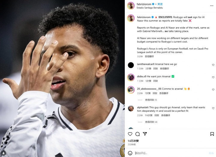 罗马诺在社媒写道:罗德里戈今夏不会加盟利雅得胜利,相关报道完全不实。关于罗德里戈与利雅得胜利的报道完全不准确,与马丁内利情况相同,双方没有进行谈判。